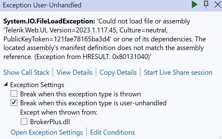 I ran the application and when I got to the point where a Telerik control was called for I received the error shown in the attached screen capture LLahman_Telerik_UPgrade_Error3.jpg. Bascially, this is the error I have received in the past when a Telerik upgrade did not complete it's job saying it could not load the file Telerik.Web.UI, Version 2023.1.117.45...... because the located assembly's manifest definition does not match.....etc.