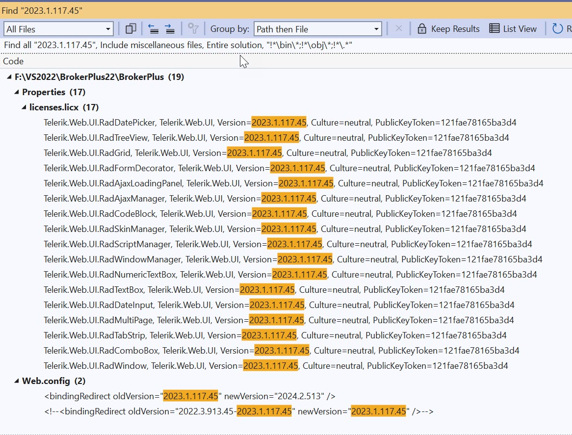 When I searched my entire solution for "2023.1.117.45", I received a whole list of licenses.licx files that still contain the old Telerik license number even the upgrade screen showed success for all controls. Refer to attached LLahman_Telerik_Upgrade_Error4.jpg .