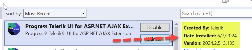 Can you please ensure that the AJAX VSX Extensions are updated to their latest version, since the earlier versions of the tool do not recognize the updated Telerik UI for ASP.NET AJAX assemblies built for .NET 4.6.2? Open Visual Studio -> Expand the Extensions menu -> Go to Manage Extensions -> Look for Telerik UI for ASP.NET AJAX and make sure that it is updated to version 2024.2.513.135 as shown in the screenshot below: