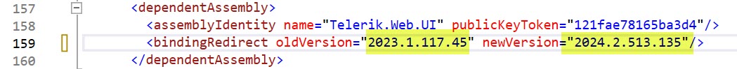 </assemblyBinding>where the newVersion="2024.2.513.462" should contain the last three numbers of the Telerik.Web.UI.dll assembly version.