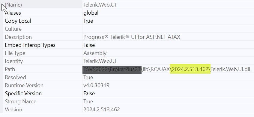 (6) I started poking around the solution references, web.config, etc. and I found an interesting item. In the solution/project's references to the Telerik.Web.UI I had the presence of mind to check the details of that particular reference. In my project (which I had not changed myself but the upgrade process had) the details of the reference were to "...\lib\RCAJAX\2024.2.513.462\Telerik.Web.UI.dll". The important point, as I was just about to learn, was that the detail pointer to the .dll file included "462" as the 4th level of the version number. Fortunately for me, my eyes picked that up because in the web.config file, I had entered "2024.2.513.135". So just to try it, I went back to the web.config file and entered "462" as the final part of the Telerik.Web.UI instead of "135".