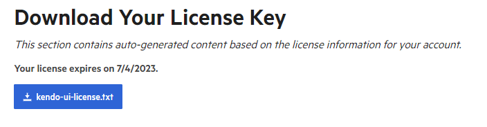 2. Copy the license key file (kendo-ui-license.txt) to the root folder of your application or alternatively copy the contents of the file to the KENDO_UI_LICENSE environment variable.