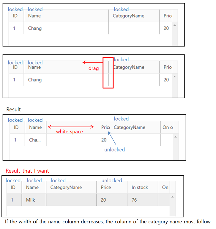I used the provided code to create an example to test the behavior and I did notice that the Price column was dragged before the CategoryName, however, I did not observe a gap, I have attached a video of the test, can you please confirm if this is the encountered undesired behavior? Here is the tested example: