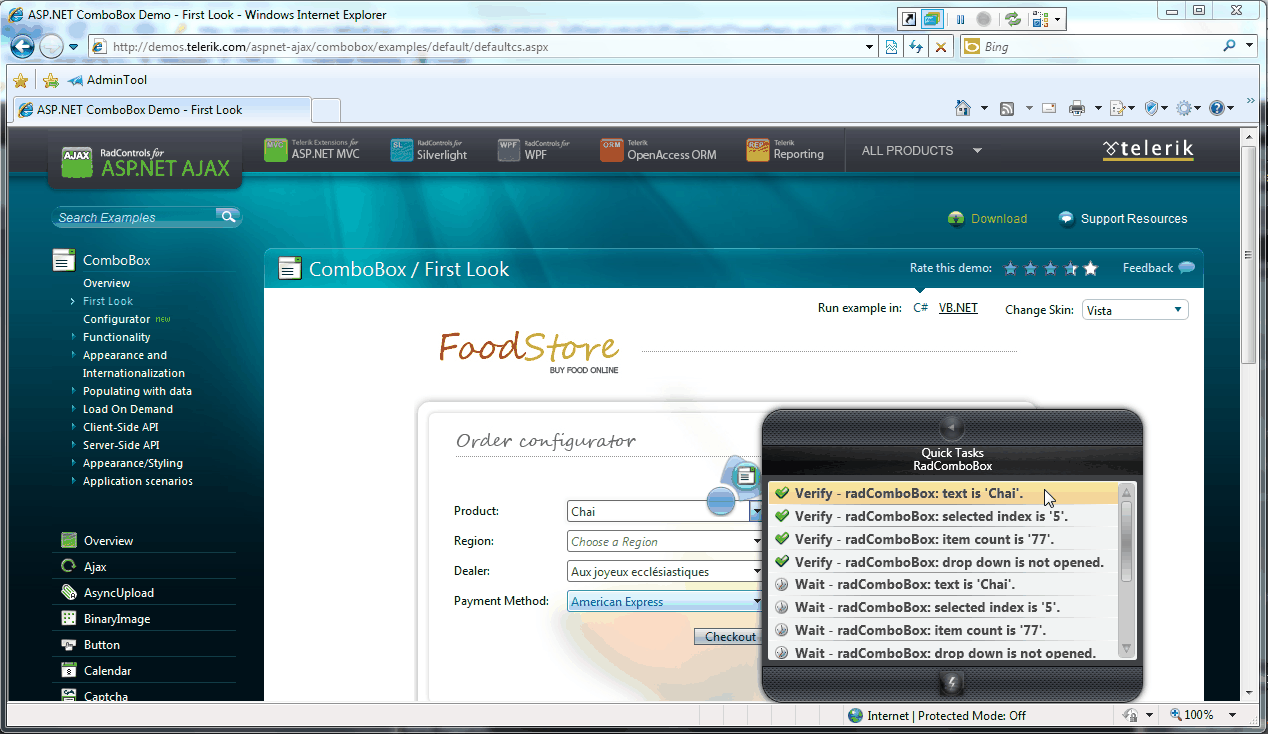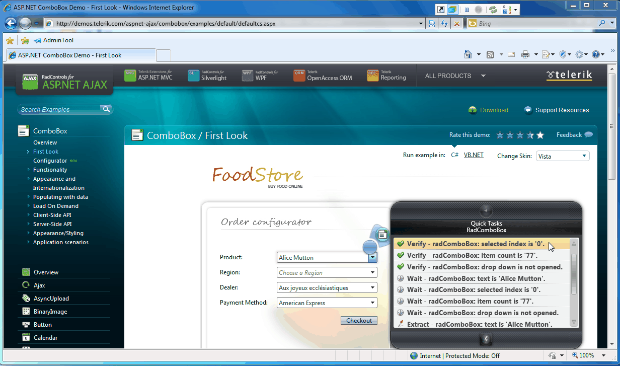 When you highlight a Telerik control element (like a RadComboBox) you can choose between multiple pop-up menus. The first one is the normal menu which treats the element as a regular HTML element. The other menus give you enhanced testing capabilities unique to the Telerik control you are testing (see screenshot 1). In the case of a RadComboBox you have additional Verification options in QuickTasks (screenshot 2).