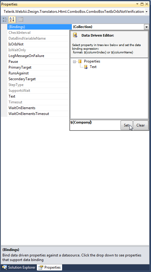 A Verify step will now appear in your test (see screenshot 4) Left-click on it to select it and go to its Properties Window. From there expand the (Bindings) menu. The Data Driven Editor opens. Click on Text and write the name of the column you want to use like this: $(Company) (see screenshot 5).