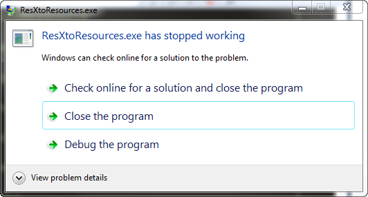 I was testing out JustMock with Visual Studio 2010 RTM. After installing JustMock, building my application received an error about ResXtoResources.exe has stopped working. The build output shows resgen.exe errors out with error code -1073740940.
