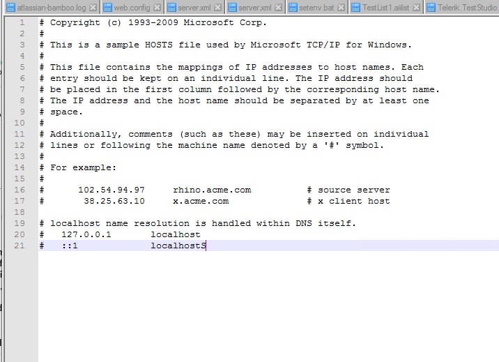 There is a side note about the hosts file - in the screenshot you shared there is a 'S' at the end of its last row. I guess that this is added by mistake when saving the file, but it still worth it to check if this is not causing troubles.