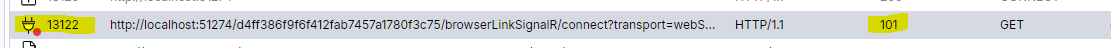 I'm trying to debug an API that uses RabbitMQ and SignalR for async communication. My C# code is throwing a connection error exception right around the time that the above shows up in my fiddler trace. Everything else in the debug session shows up like below: