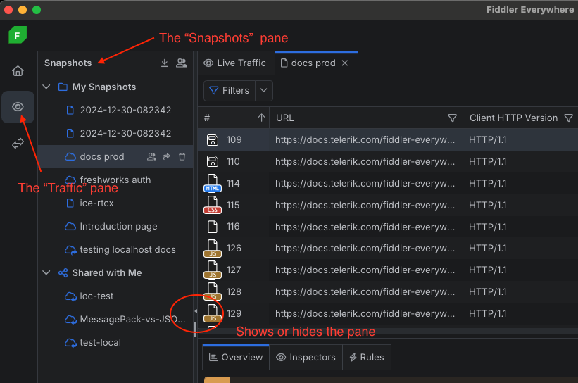 Note that this pane will contain only traffic explicitly saved by the user (locally or in the cloud). Fiddler Everywhere does not store the ongoing traffic captured live - it just stores it in memory and shows it in the Live Traffic grid. You can learn more about saving snapshots from the following documentation article: