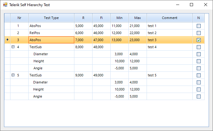 I think I can do it with some modified data structures specialized for editor, I can use nullable properties for tolerances and parameters to hide certain cells, handle some events to have those empty cells readonly, maybe it would be tricky to show indented subitem name in test type combo box column, but I think this solution would be a little bit ugly. Is there any better way to do this?