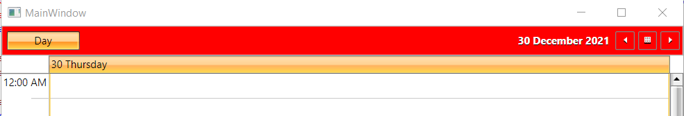 To achieve the wanted result, you could subscribe to the Loaded event of the RadScheduleView control, and utilizing the ChildrenOfType extension method, get the Border element with x:Name="NavigationHeader". On the returned Border control, you could set its Background property to the desired value. The following code snippet shows the Loaded event's implementation, to target the specified Border element and modify its background color: