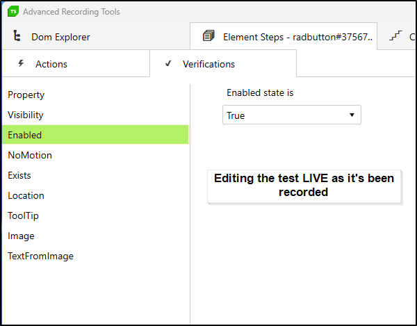 I'd love it if this Enabled verification option was available in the post-recording editor as with an application that makes a lot of async calls and disables parts of the UI while those calls complete this step will be used hundreds and hundreds of times in our tests. I realise I can run the test and pause it where I need to inject the wait, but again, doing this hundreds of times will make creating these tests very difficult and slow.