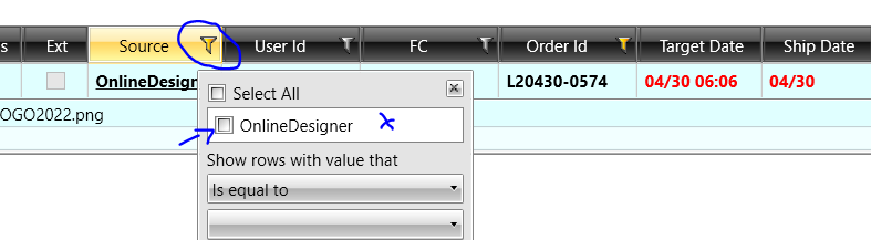 My grid is filtered and it works for all the columns (Just in case it wasn’t clear, the grid is indeed filtered by Source and Order Id). For all the fields that are strings, the filters look good when it shows: