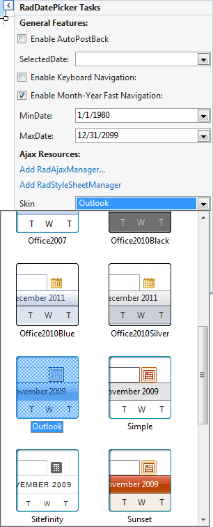 In the RadDatePicker Smart Tag that appears automatically, choose "Outlook" from the drop-down list for the Skin property: