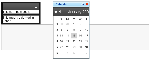 - Try to drag the first RadDock control into the second dock zone. It snaps back because the second dock zone is in its ForbiddenZones list.