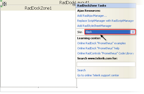 Drag a RadDockZone control from the toolbox onto the surface of the RadDockLayout component. The RadDockZone Smart Tag should appear automatically. In the Smart Tag, set the Skin property to "Black":