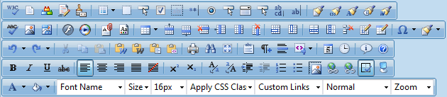 RadEditor Toolbars are containers that accommodate the buttons and dropdown lists of the various tools. Developers can group buttons in a number of toolbars according to the specific purpose of the RadEditor implementation. The figure below shows an editor with its full set of tools, distributed in five toolbars. You can configure a toolbar with as few or as many tools as your application requires.