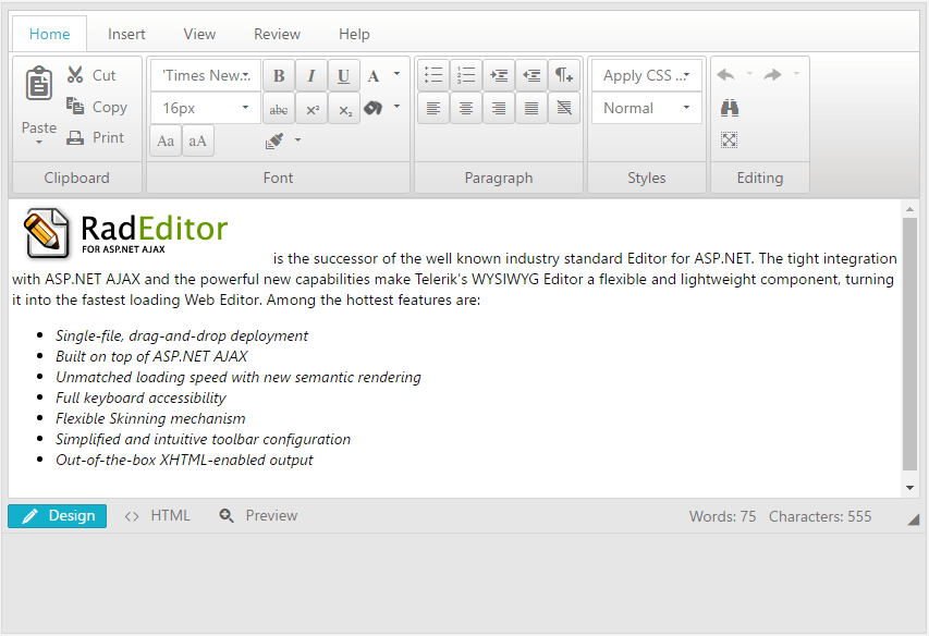 Figure 1: The default RibbonBar toolbar of RadEditor.