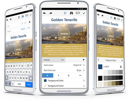 - Touch-optimized UI to easily navigate through multiple tools - toggle the device's keyboard, switch to HTML mode, etc.;