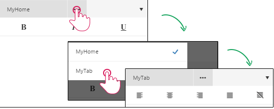 As shown, you can add tabs and tools with the same approach used for the desktop-oriented RadEditor (Add Standard Buttons). Additionally, you should define the Tab property in order to configure a title for the Tab.