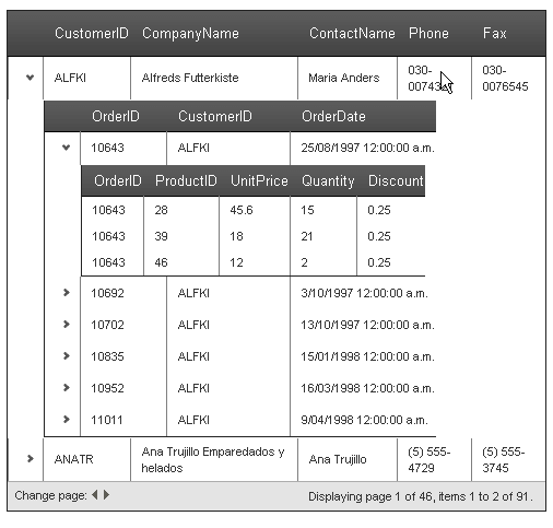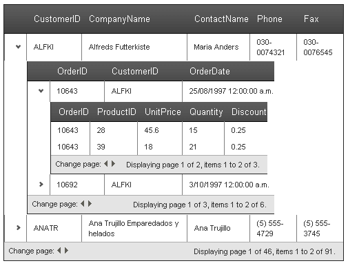 • The third example shows a RadGrid control that enables paging with a PageSize set to 2, but with a detail table that overrides this setting.