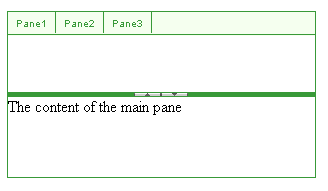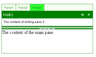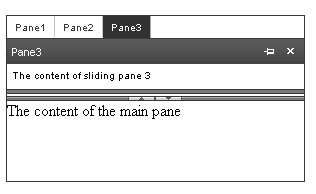 ASP.NET<telerik:RadSplitter RenderMode="Lightweight" runat="server" ID="RadSplitter1" Orientation="Horizontal" Width="90%" Height="90%"> <telerik:RadPane runat="server" ID="RadPane1" Height="80px"> <telerik:RadSlidingZone runat="server" ID="RadSlidingZone1"> <telerik:RadSlidingPane runat="server" Title="Pane1" ID="RadSlidingPane1" Height="50px"> The content of Sliding Pane 1 </telerik:RadSlidingPane> <telerik:RadSlidingPane runat="server" Title="Pane2" ID="RadSlidingPane2" Height="50px"> The content of sliding pane 2 </telerik:RadSlidingPane> <telerik:RadSlidingPane runat="server" Title="Pane3" ID="RadSlidingPane3" Height="50px"> The content of sliding pane 3 </telerik:RadSlidingPane> </telerik:RadSlidingZone> </telerik:RadPane> <telerik:RadSplitBar runat="server" ID="RadSplitBar1" CollapseMode="Both" /> <telerik:RadPane runat="server" ID="RadPane2" Height="80px"> The content of the main pane </telerik:RadPane> </telerik:RadSplitter> -