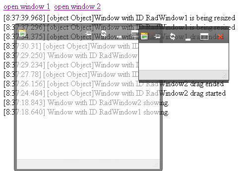 <div>element on the page (in the sample above its ID is "eventConsole") and a set of 12 event handlers (the OnClientResize would flood the console, this is why we leave it out), each of which takes two arguments and calls LogEvent to display information about the event. After the<script>section, the markup adds two links to the page for opening the windows, and a<div>section to display the information written by theLogEventfunction. -