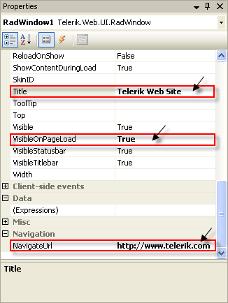 In the Behavior section of the Properties menu, set the Title property to "Telerik Web Site".