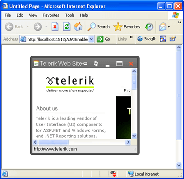- Click the "Show Telerik site" label. The window appears 30 pixels below the label you clicked. (If you had not set an OffsetElementId, its position would be relative to the upper left corner of the web page instead of to the label.) Note that the window title bar has changed its appearance to reflect the new skin and that there is no status bar.