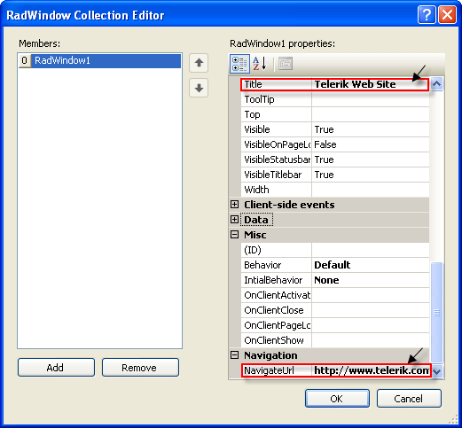 In the RadWindow Collection Editor, click the Add button to create a new RadWindow control.Use the Properties pane to set its properties to match those of the window you created before: