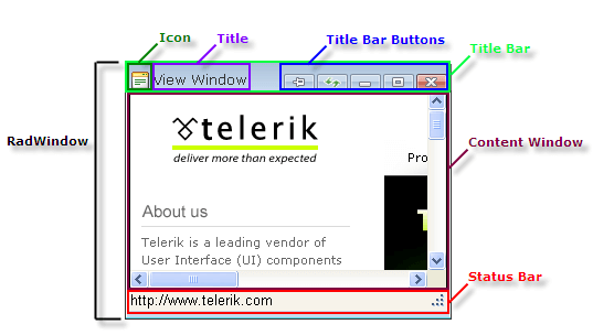RadWindow controls contain a title bar, which displays the icon, title, and title bar buttons, a content window, and a status bar. These are all configurable using the properties of RadWindow.